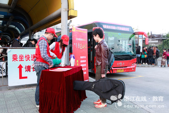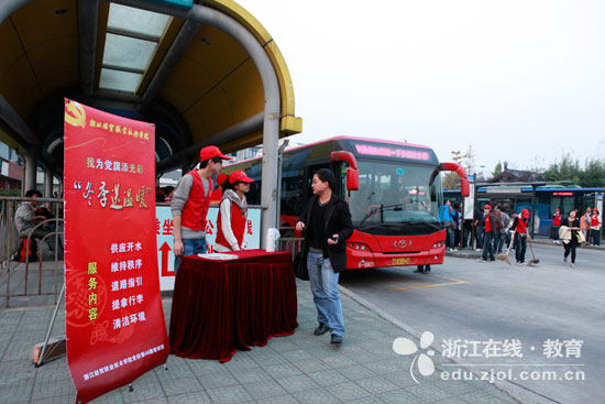 浙江在线:经贸学子公交车站设服务台 一杯开水温暖路人心
