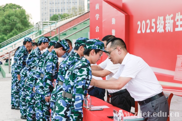 典礼现场,主席台领导为新生代表佩戴校徽,对每一位“新经贸人”表示祝贺。